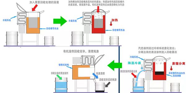 可選擇單次循環或24小時連續全自動循環運行,內置自動加料和真空減壓回收裝置的一體機,雙段式加熱多段溫控設定,針對要回收的混合溶劑的成分讓不同沸點的溶劑依順序從低溫、高溫分批蒸餾出來。